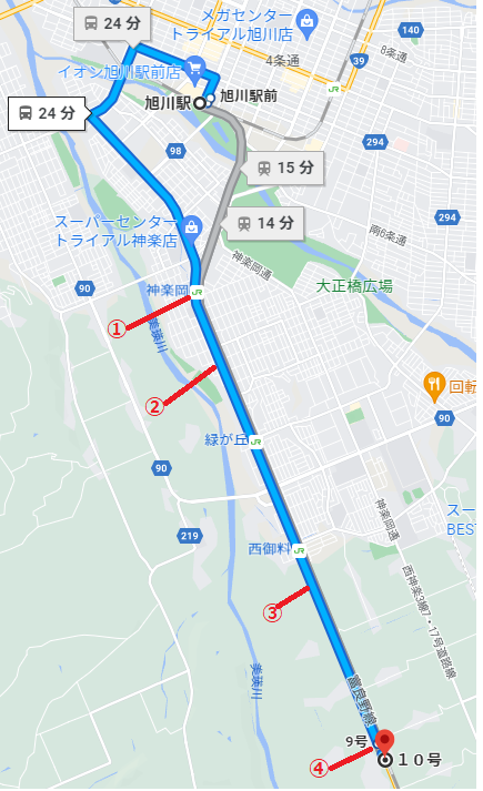 バス:24分(39番白銀行き,40番美瑛行き。どちらも同じ道です)