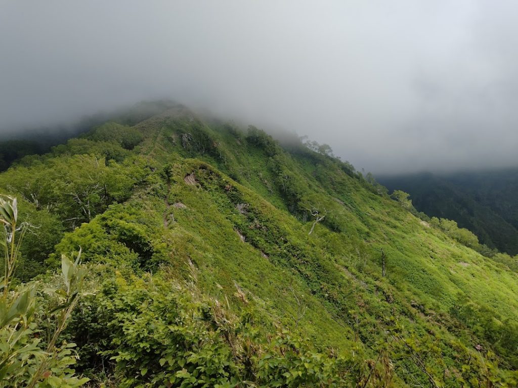 尾根の道の横は、笹などで風よけになるものが多かったですが、笹も崖に横に生えて上向きになっている状態なので、笹を踏めば落ちるので注意です。