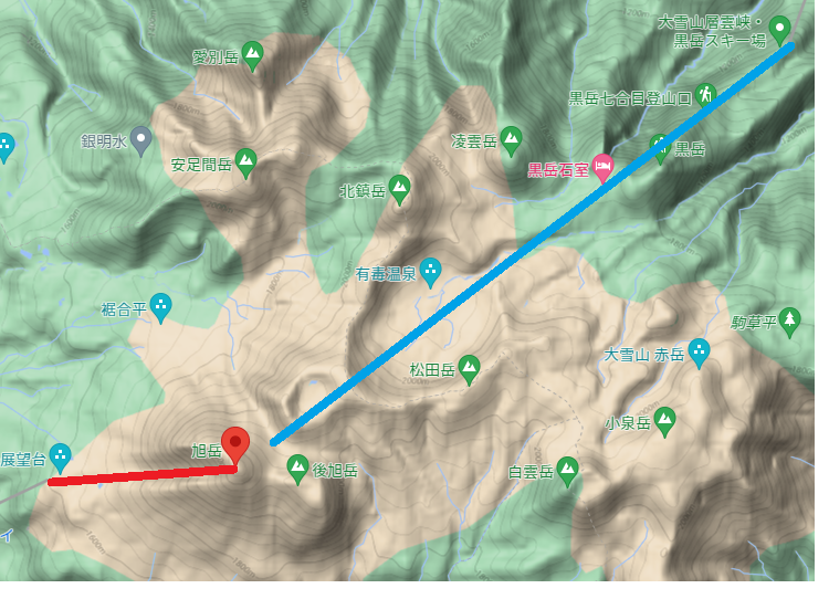 青の線が、黒岳から登った場合の1日目の予定でした。途中の黒岳石室で終わった可能性もありますが。