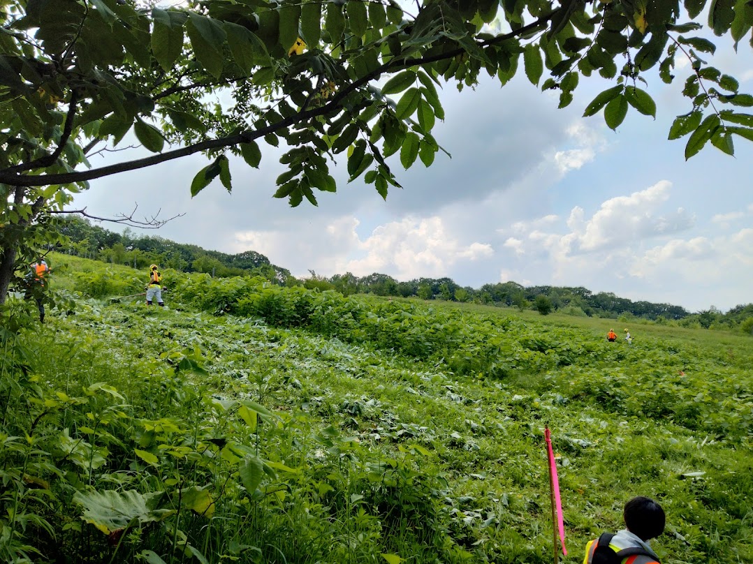 下刈の範囲は、その「左の白い車が下端左端」で「右の青白テントが上端の真ん中」です。