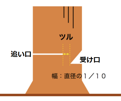 ガンマークの延長線状に倒れるため、「①水平の切れ目を入れる」の段階で、ガンマーク越しに15m先の場所を覗いて切れ目の調整をします。