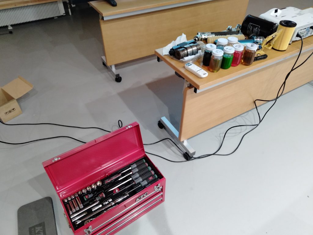 ・それぞれのメンテナンス用の油。劣化した油の実物の確認。