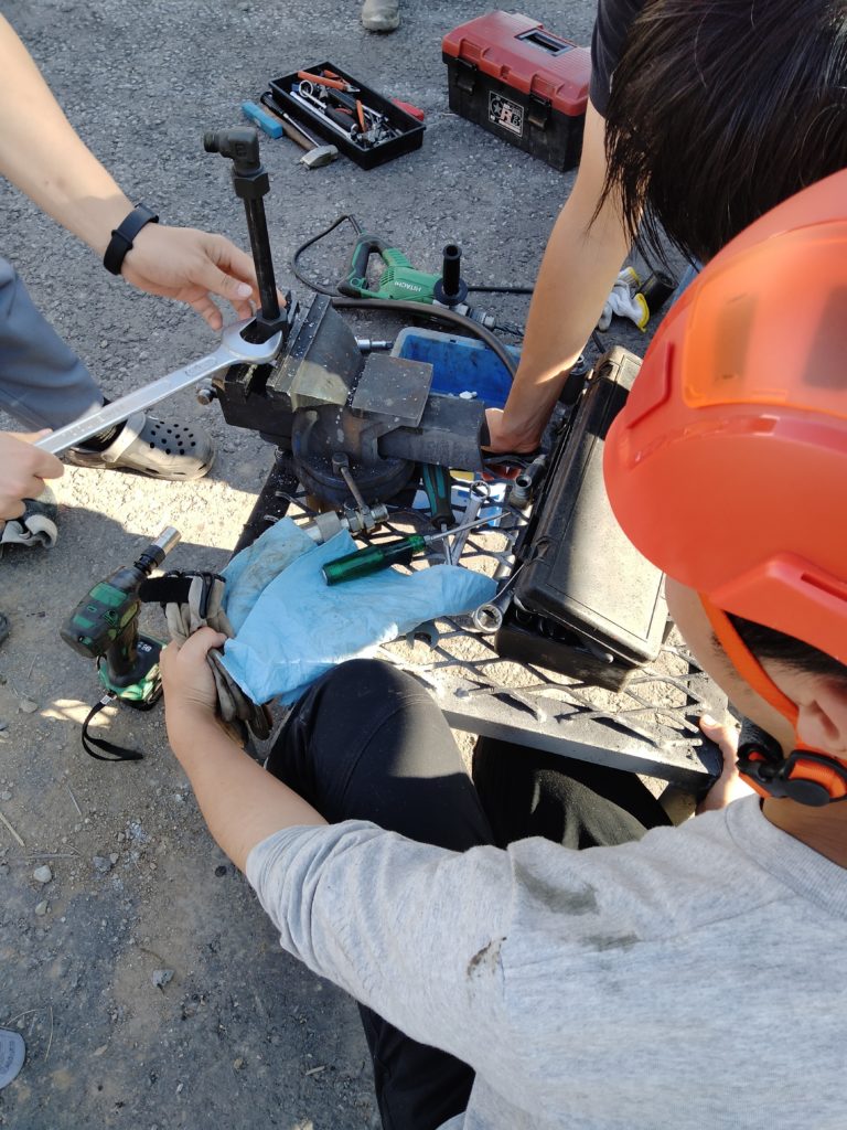 実機のメンテナンス練習とバゲットの交換(グラップル→バックホウ→グラップル)を行いました。