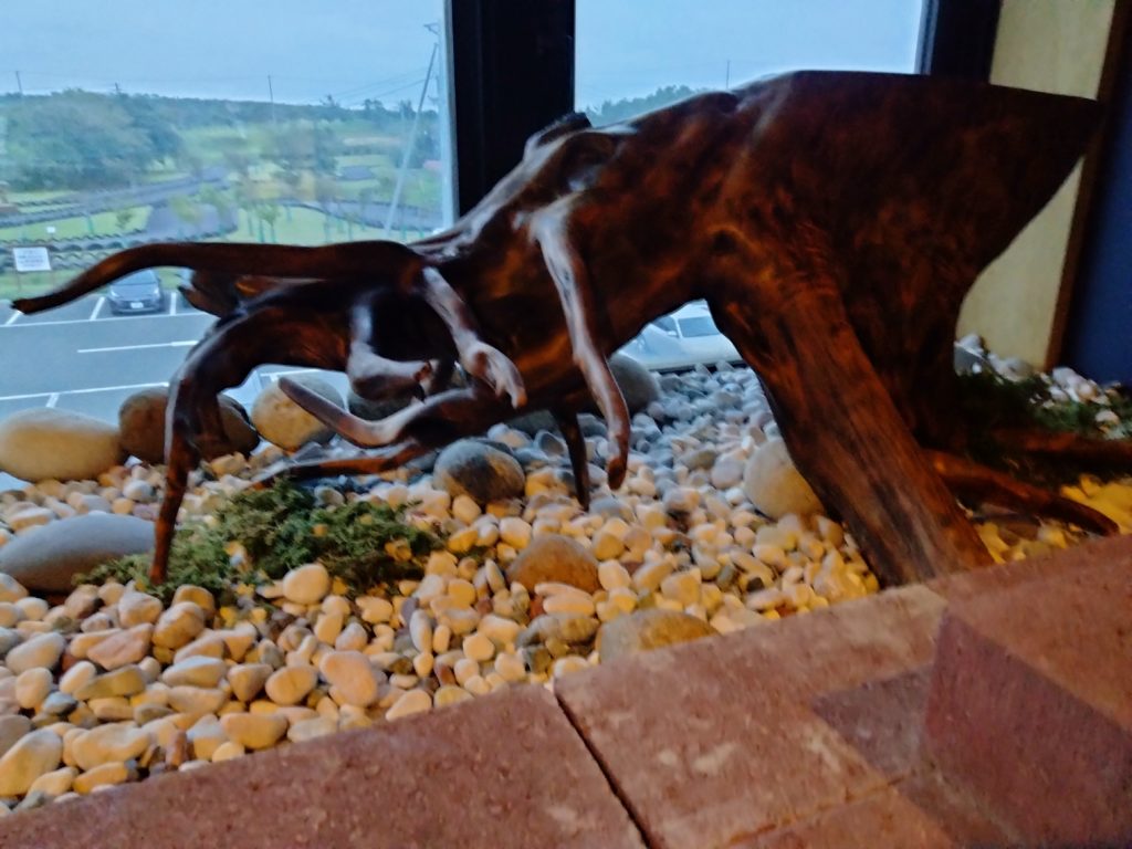 右側は喫煙所のオブジェですが、最初は夜に暗いところで見たため、「鹿の頭」→「エイリアン」と勘違いし、明るくなってから「木の根」とわかり安心しました。