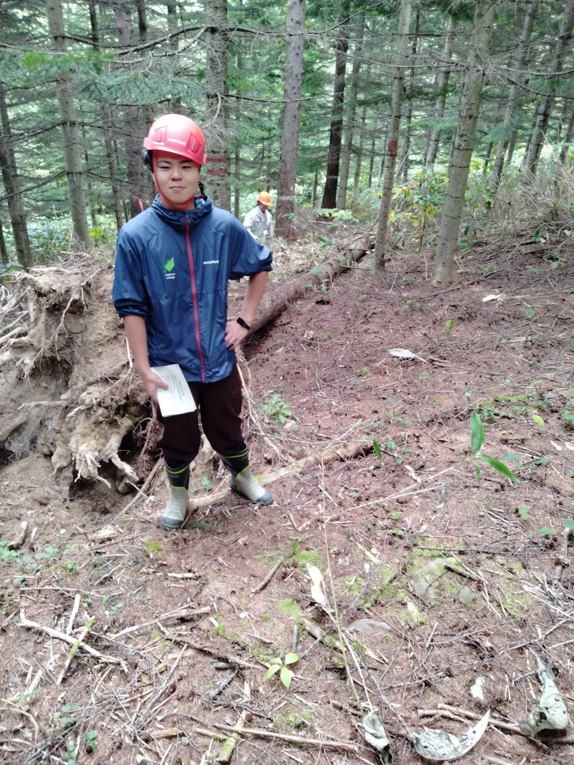 間伐3回目(カラマツ51年)の後に風倒木の被害があり、そのまま残しているそうです。