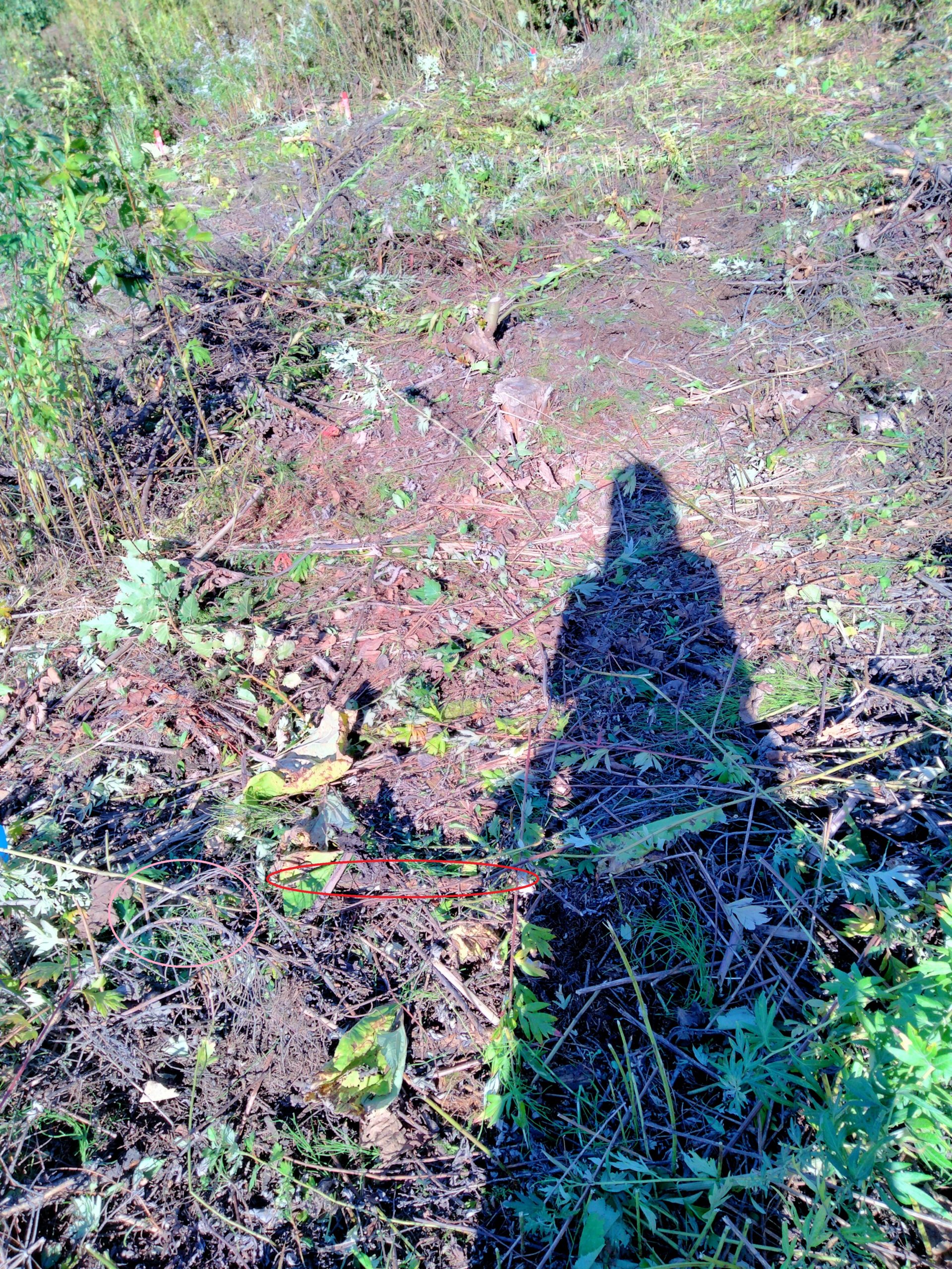 右側:草刈りをせず、草の上に枝条をぶん投げてます。