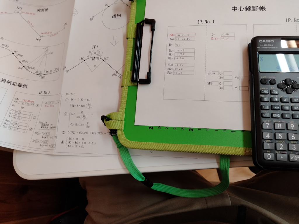 関数電卓を使用して、SP20等の測点の位置や角度を計算する。高さの計算。