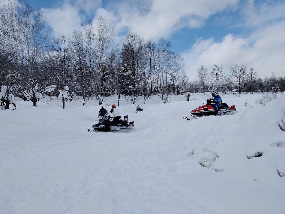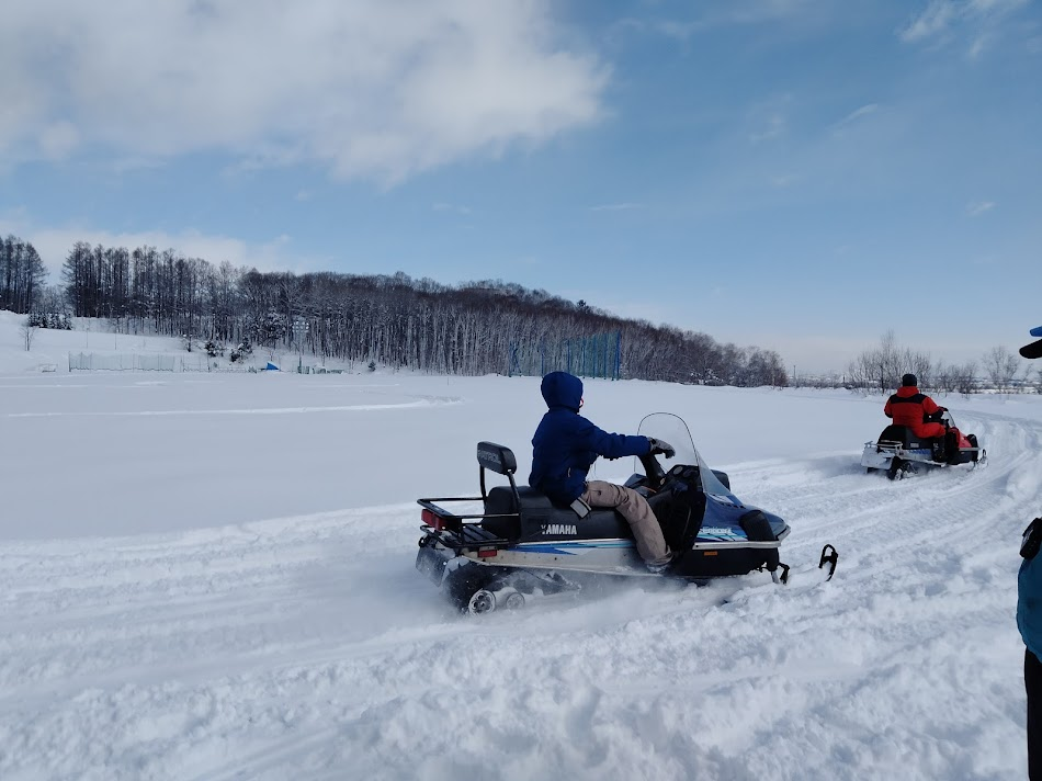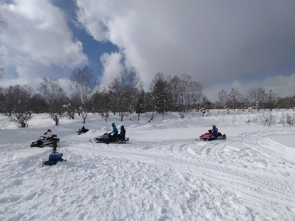 冬山で調査に行くためのスノーモービルの練習です。