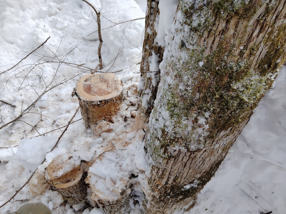 この木は夏から倒れそうだなとは思っていましたが、雪の重みで地面まで下りてきてしまいました。