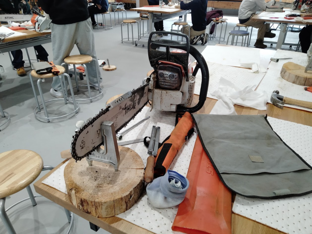 北森カレッジでは、1年生はスチール、2年生はハスクバーナのチェンソーを使います。