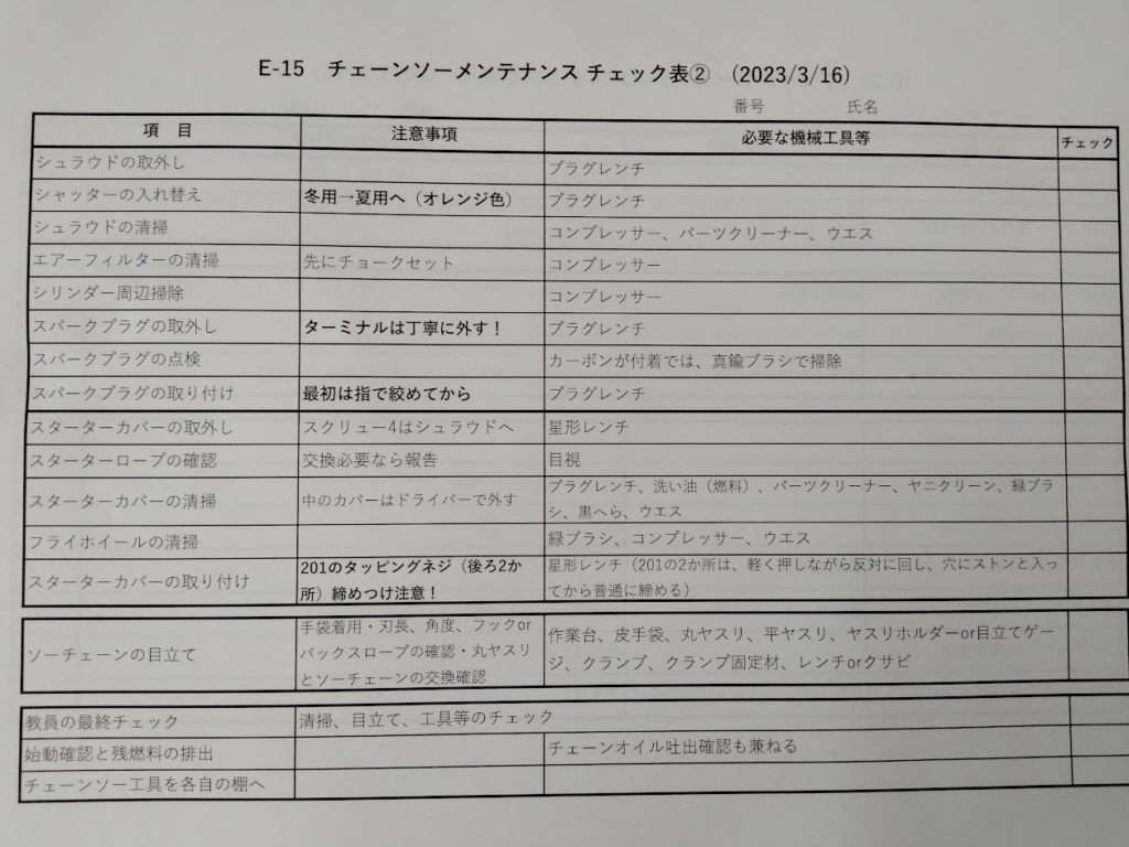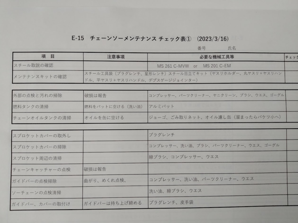 下のチェックリストに従い、チェンソーの掃除です。