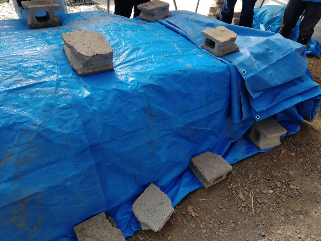 むしろ、ポリプロピレン?、ブルーシートで、湿度と温度を保持する仮伏せを実施。