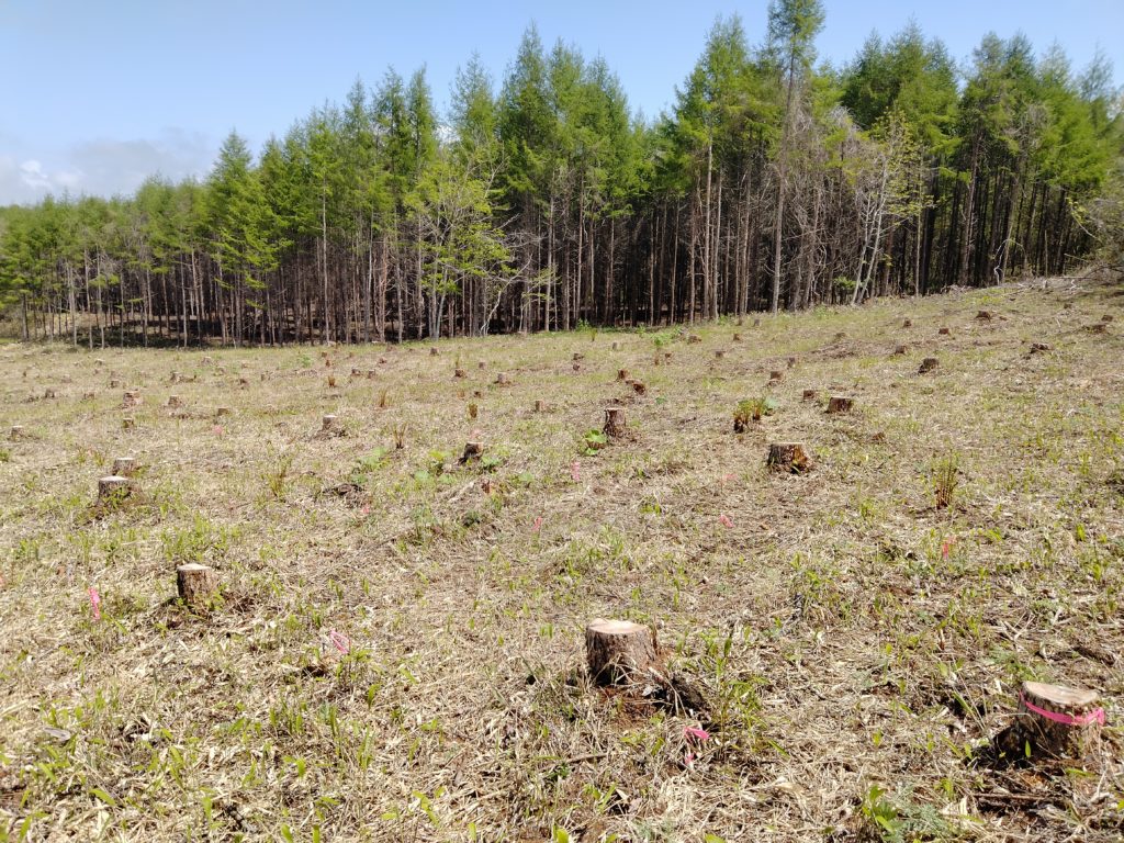 伐根を確認するのですが、枝条の下に隠れていたりで探すの大変。
