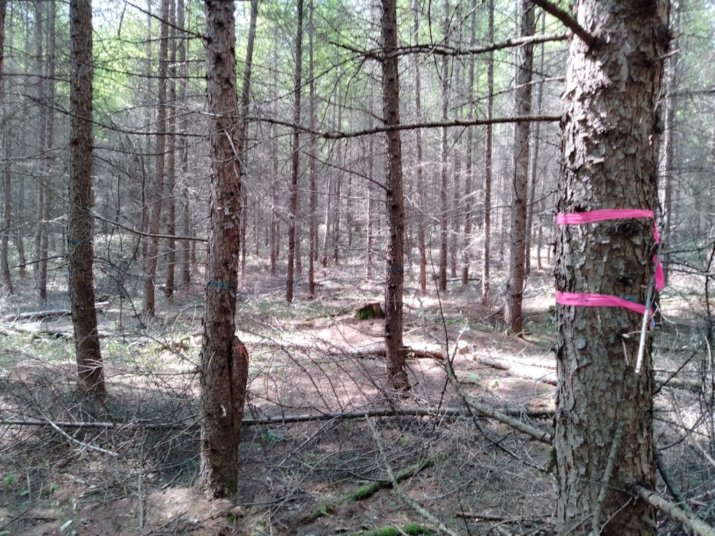 ピンクテープには、標準地内に何本の樹が存在し、何本伐木するのか。が記載されていて、その通りに間伐が行われたかを確認しました。