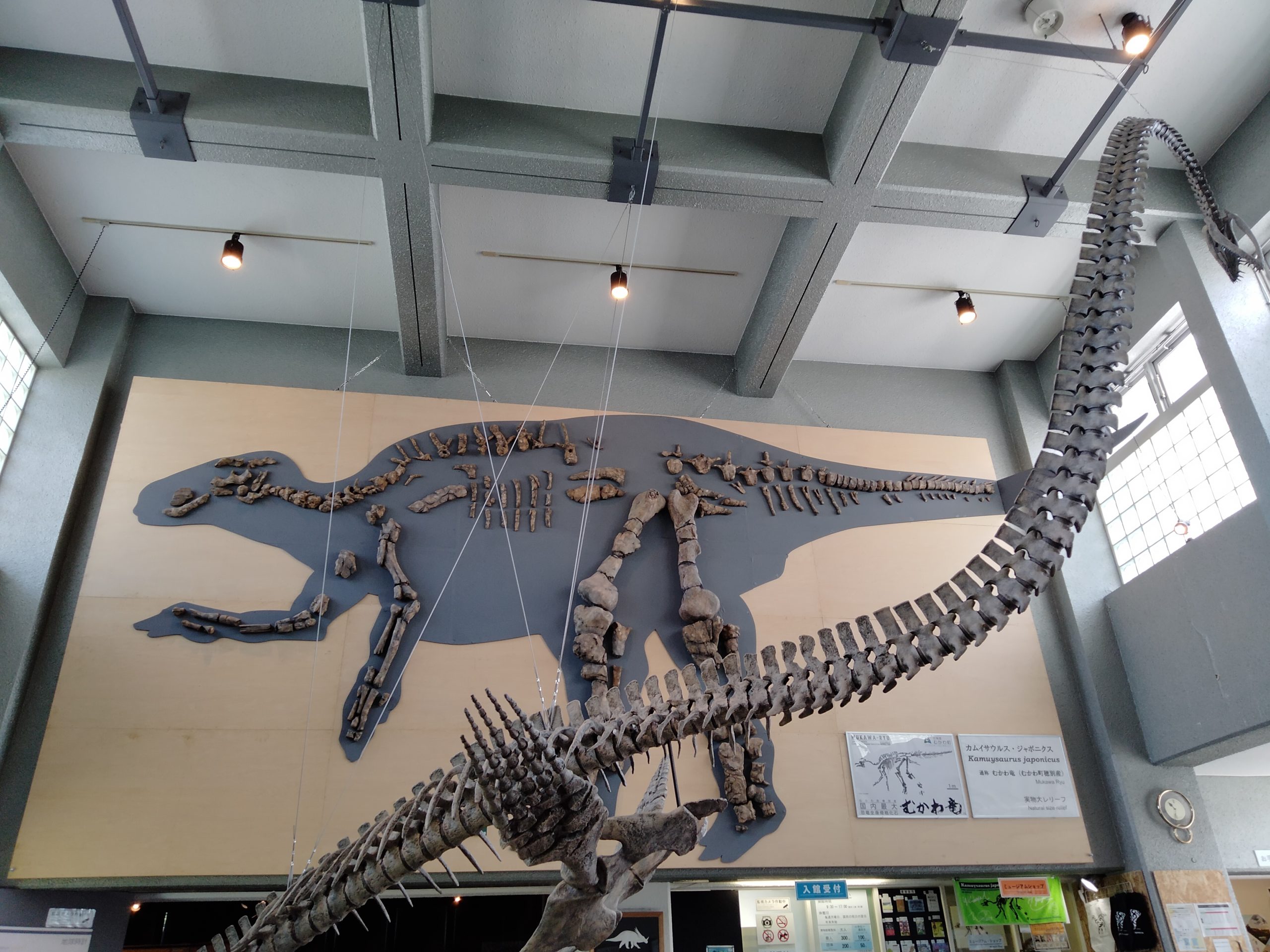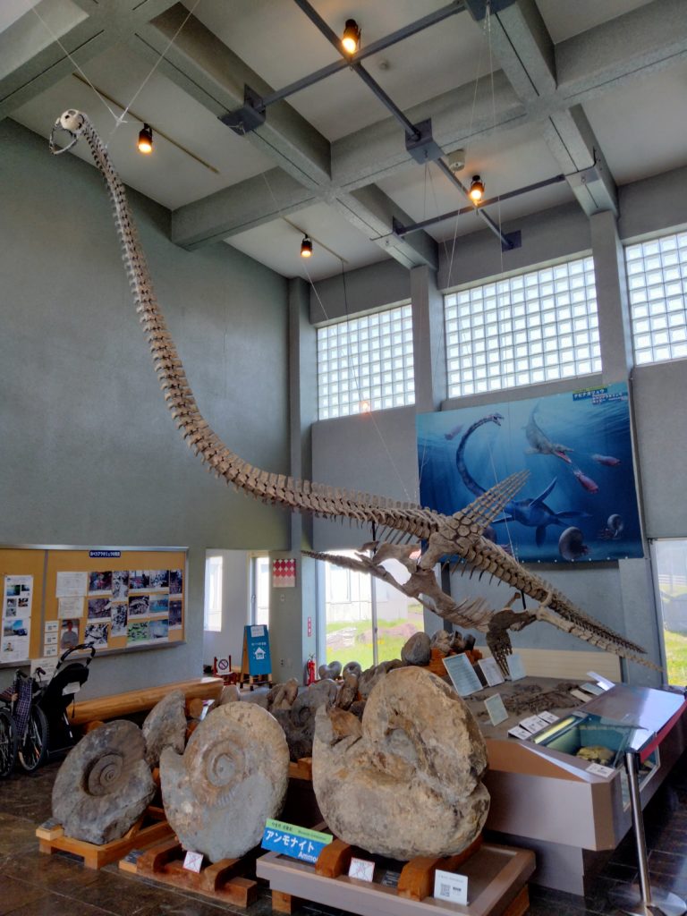 展示場に上の真ん中のカムイサウルスがあったため、これかぁ。と思ってたのですが、博物館を1周して休憩して、首長竜をもう一度。と思って見上げたら発見。