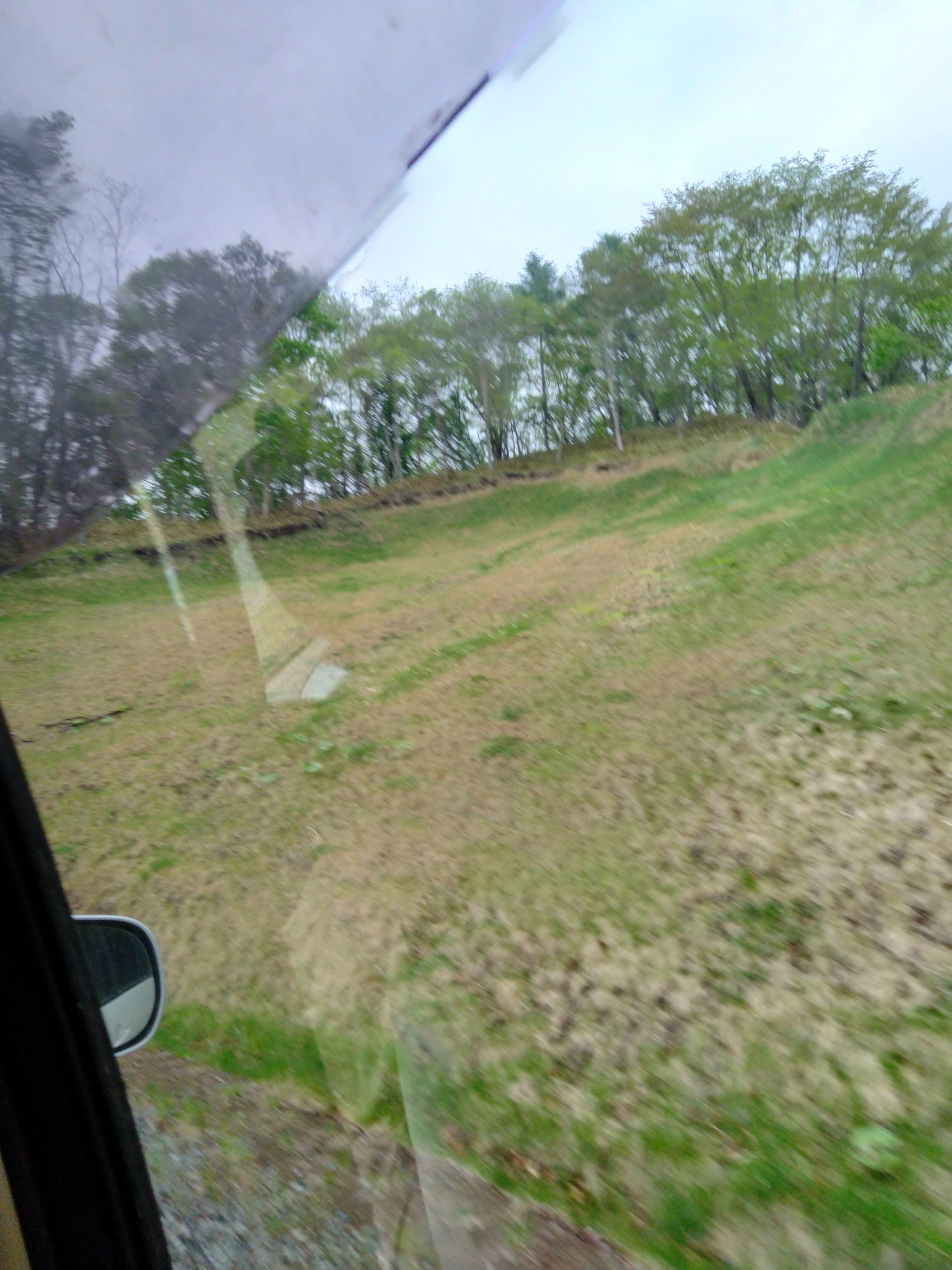 崩壊斜面に草を生やして土壌を作ろう、雨による崩落を防ごうとしているようですが、あまり上手くいってないようです。ここはまだいい方のようです。
