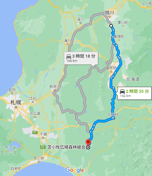 苫小牧広域森林組合は、旭川から3時間弱。苫小牧市からは1時間ぐらいの距離にあります。