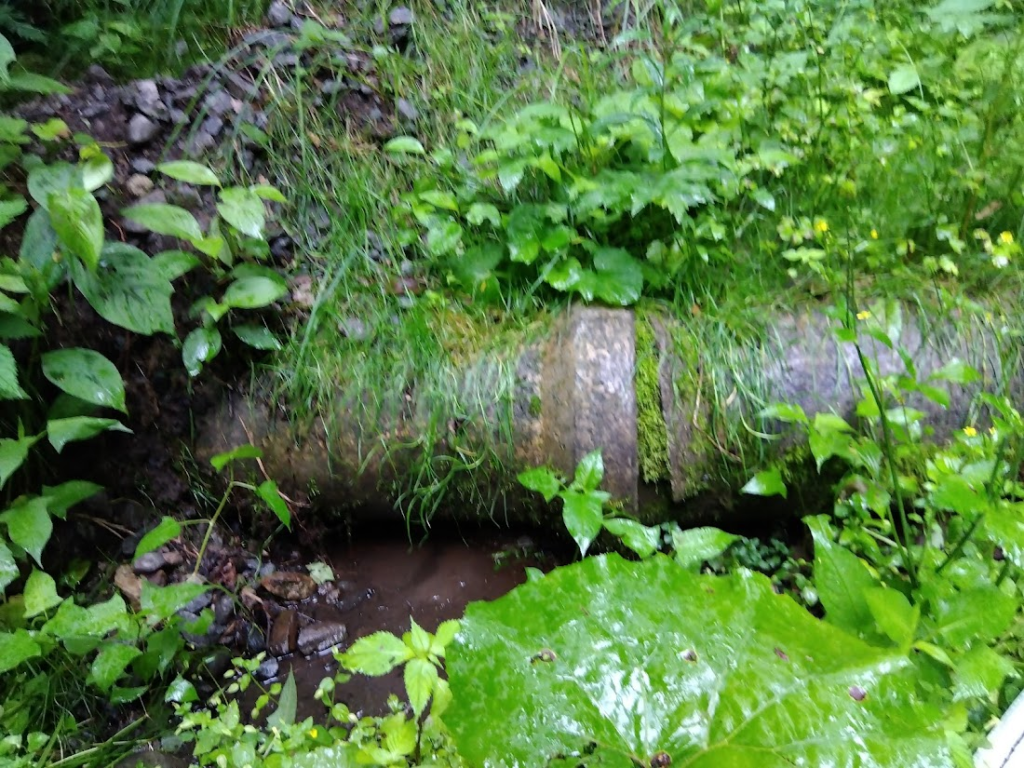 土管保持:土管の下に空間ができて水溜まりになっていたため、土嚢袋を詰めて、これ以上土管が下がって折れないようにしました。