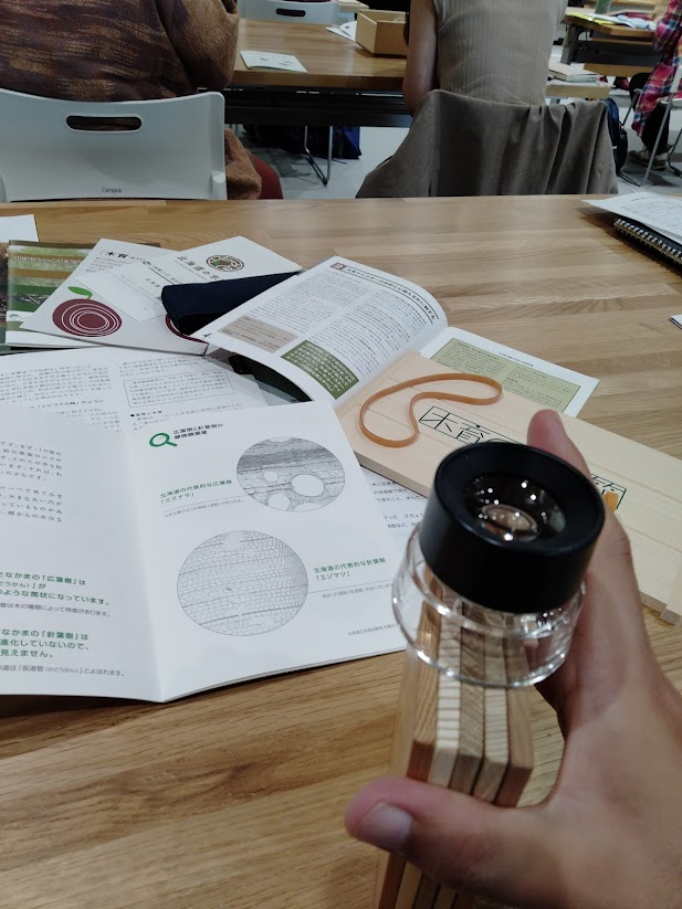 「木育の玉手箱」という教材いいですね。針葉樹、広葉樹の散孔材、環孔材、放射孔材の違いを見る。というもの。そして10倍ルーペの使いやすさ。に吃驚。