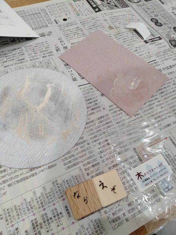 エゾマツとミズナラの木片にやすり掛けをし、クルミの実を潰してオイルを塗って、ハンダごてで字を書いて 磁石を作る。 小さい子供でもできるいい教材じゃないでしょうか。