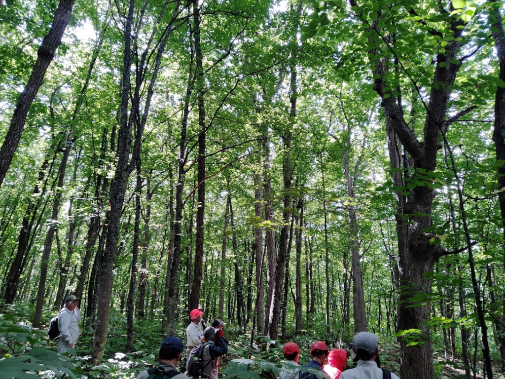 道を作ると、光を求めて樹が寄ってくる。道を作る際には、全体の傾斜も計算する、柏の利用の話や、広葉樹の周りに道を作る際には下側を通す、ボサを捨てる場合は山側20%の位置にすると水や栄養が良くなる。 などのお話をされ、勉強になりました。