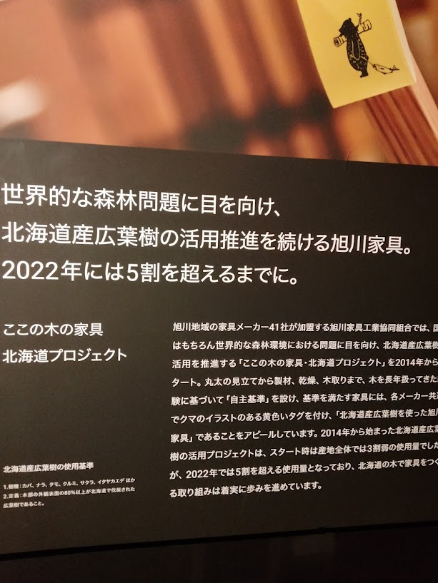 そして、いい家具のためには広葉樹が大事。ということで、テーブルや椅子等を飾っている/打っている場所が旭川にあります。