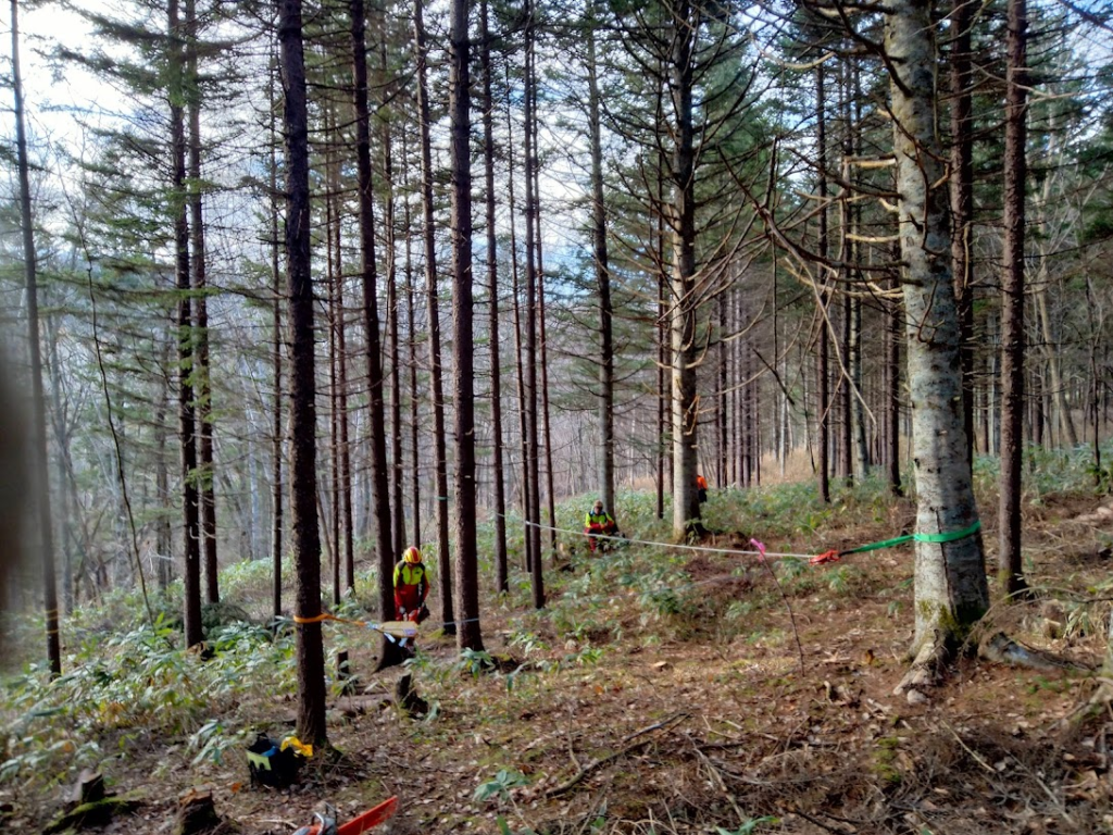 伐倒前からロープを仕掛け、伐倒方向を重心と異なる方向へ変えた上で、かかり木作成。