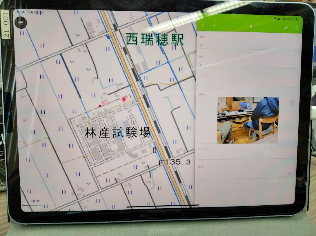 左QField:QFieldでポイントを打ち(GPS位置情報)、写真を撮る。という動作を行いました。