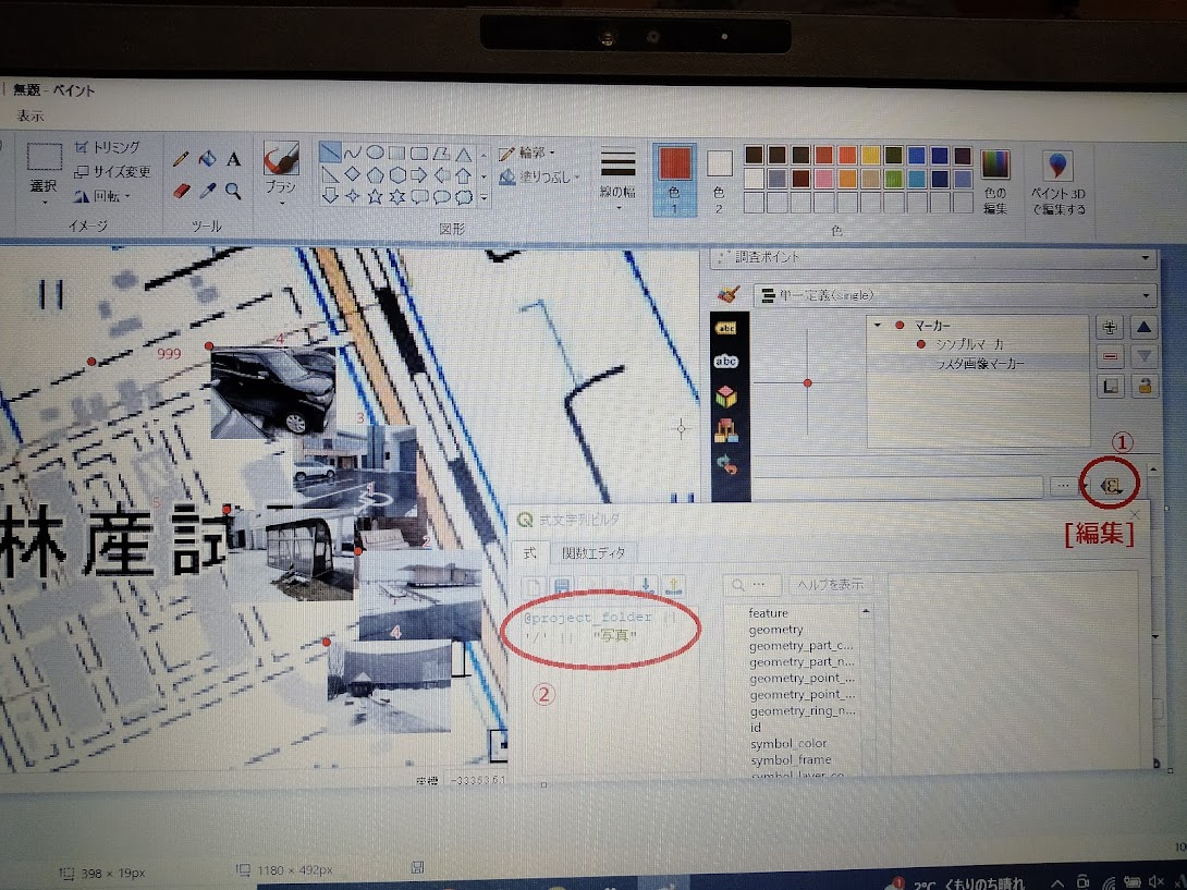 地図データ。ポイントNo,写真のフィールド。のデータをパソコンで入れてQFieldに入れた。