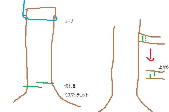 つながっている方向に切ると、途中でつながりが切れて上部がどちらに倒れるか分からない。